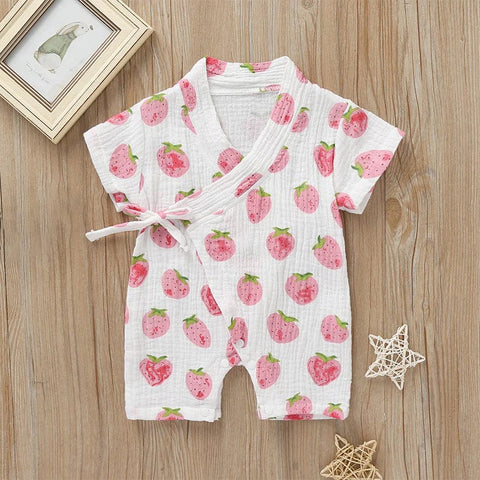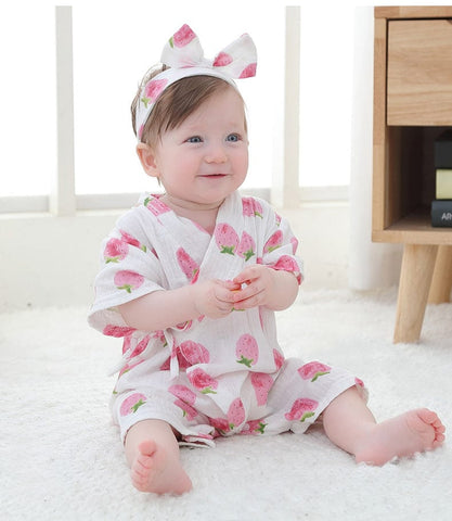 This floral kimono romper is a must-have for your baby wardrobe. Besides being super cute, these floral kimono rompers with side snaps or ties minimize contact with the baby's still-sensitive umbilical cord stump.