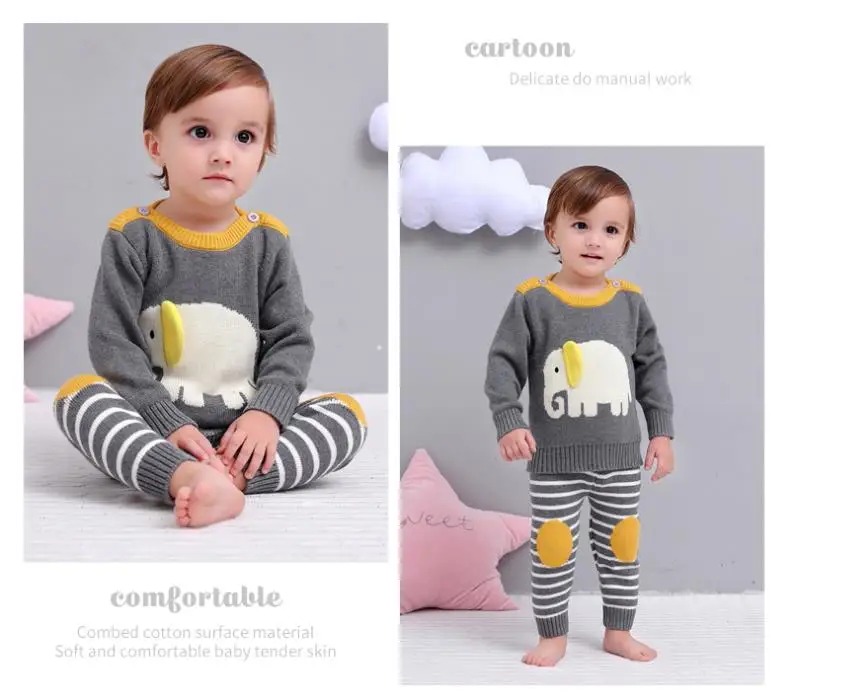 This cartoon elephant sweater set features a round neckline, long sleeves, contrast waistband, a fun cartoon elephant on the front and matching pants. It is made of soft and comfy material. This set will bring the softest cuddles ever.