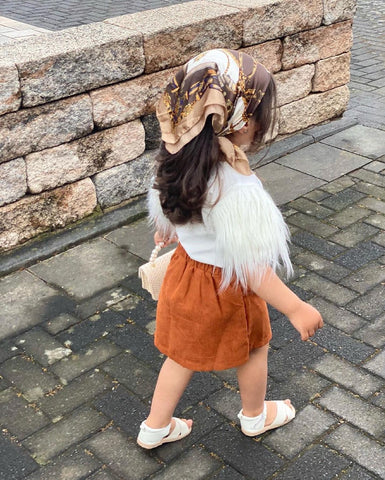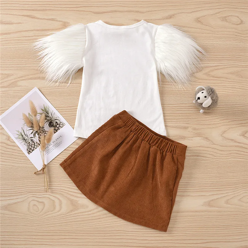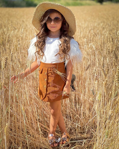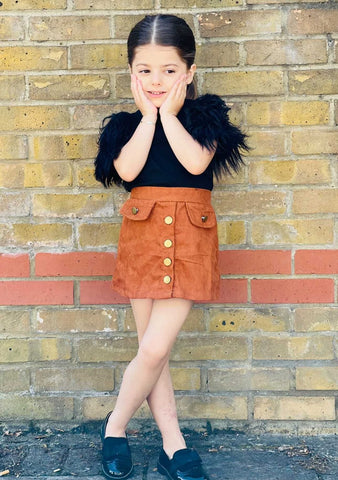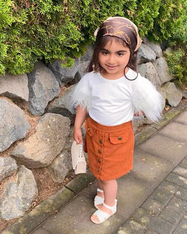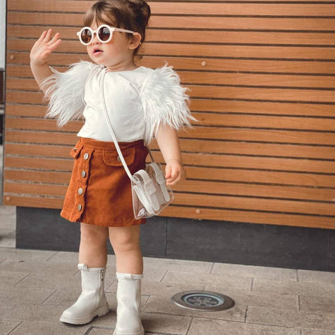This tee with a short fur sleeve outfit is the perfect basic to have in your little one's wardrobe. It has a fur sleeve and makes this tee looks so adorable. In a feminine A-line silhouette, this classic style features a high waist, two front pockets and has buttons down the front for a '70s vibe. It looks great with boots in the cooler months and sandals when it's warm.